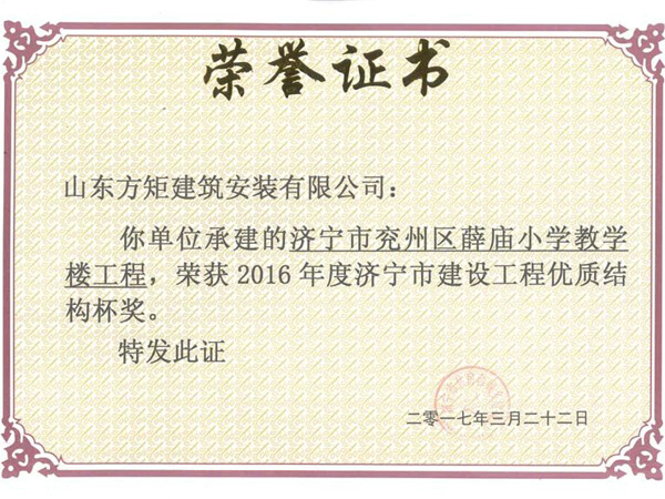 兗州區(qū)薛廟小學(xué)教學(xué)樓工程優(yōu)質(zhì)結(jié)構(gòu)杯獎